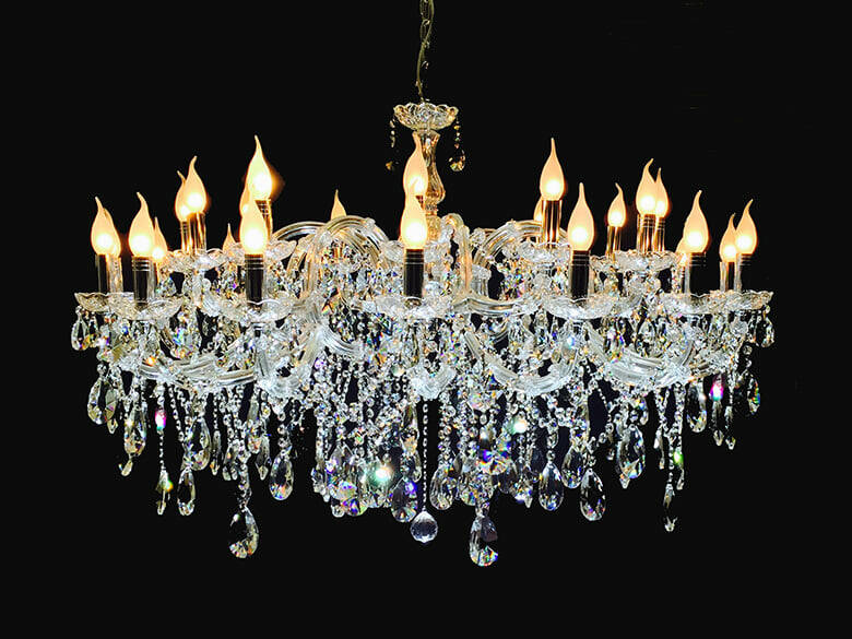 Een Mega Kristal Kroonluchter (Maria Theresia) met 28 lichtpunten, verdeeld over 2 etages, heeft een elegante vorm en is zéér rijkelijk behangen met verschillende Kristal pedants, octagons en bloemrozetten. Het frame van deze kroonluchter is bedekt met glasstroken en vastgezet met bloemrozetten. Op iedere arm bevindt zich een Kristallen schaal met kristallen pegels. Centraal bevindt zich een sierlijk geslepen vaas. Onderaan hangt een schitterende geslepen kristallen bol.