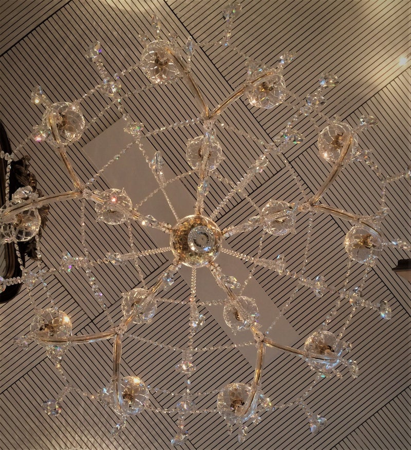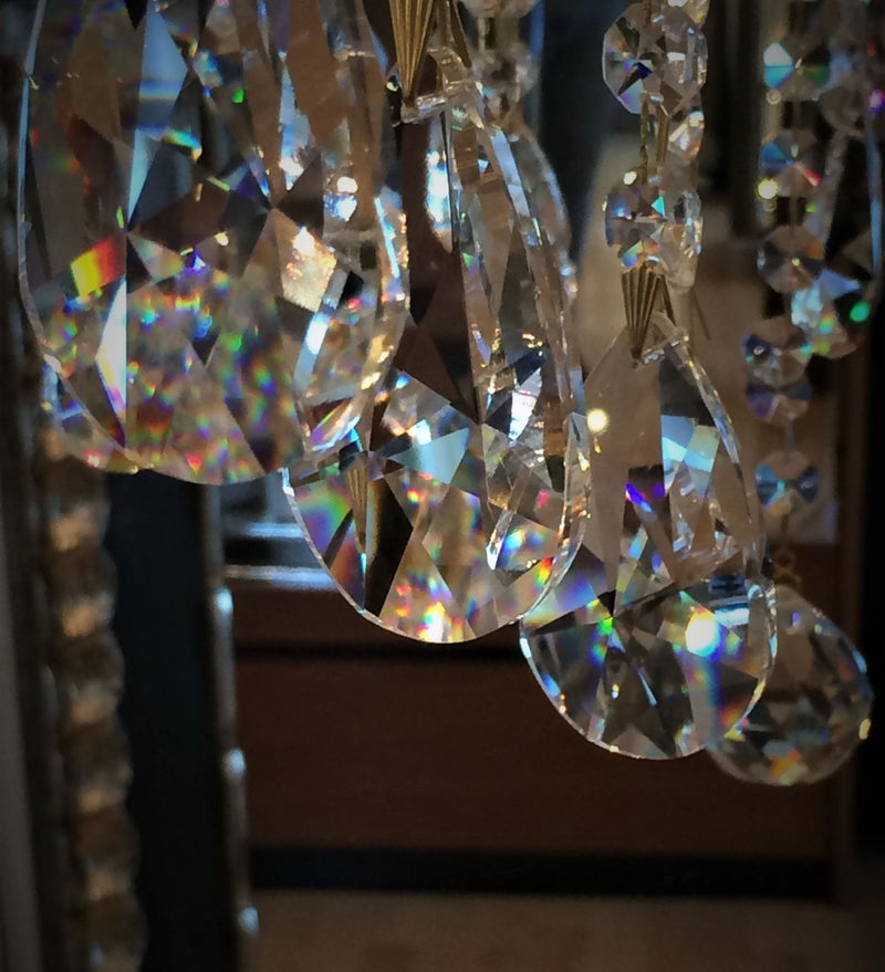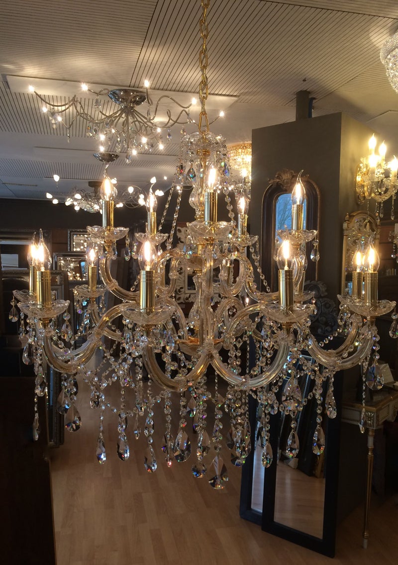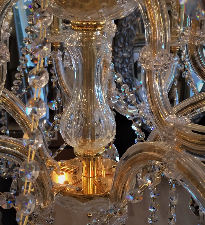 Deze zeer mooie volle Maria Theresia met 15 lichtpunten verdeeld over 2 etages is rijkelijk behangen met verschillende kristal pegels, octagons en bloemrozetten. Het frame van deze kroonluchter is bedekt met glasstroken en vastgezet met bloemrozetten. Centraal bevindt zich een sierlijk geslepen vaas. Onderaan hangt een schitterende geslepen kristallen bol.