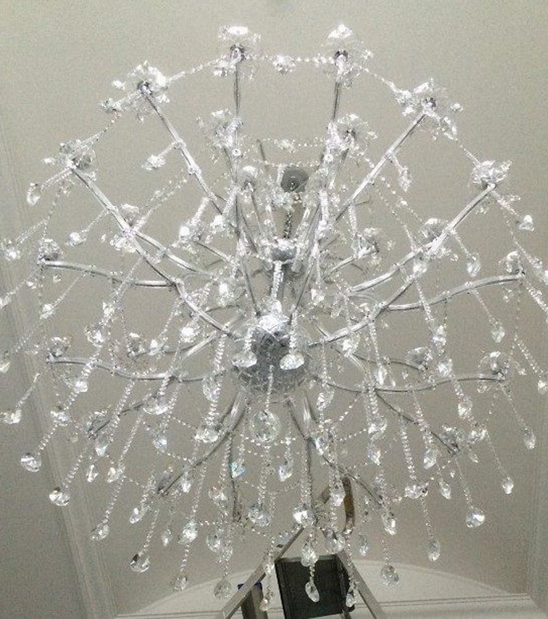Een Mega Kristal Kroonluchter (Maria Theresia) met 32 lichtpunten, verdeeld over 3 etages, heeft een elegante vorm en is zéér rijkelijk behangen met verschillende Kristal pedants, octagons en bloemrozetten. Het frame van deze kroonluchter is bedekt met glasstroken en vastgezet met bloemrozetten. Op iedere arm bevindt zich een Kristallen schaal met kristallen pegels. Centraal bevindt zich een sierlijk geslepen vaas. Onderaan hangt een schitterende geslepen kristallen bol.