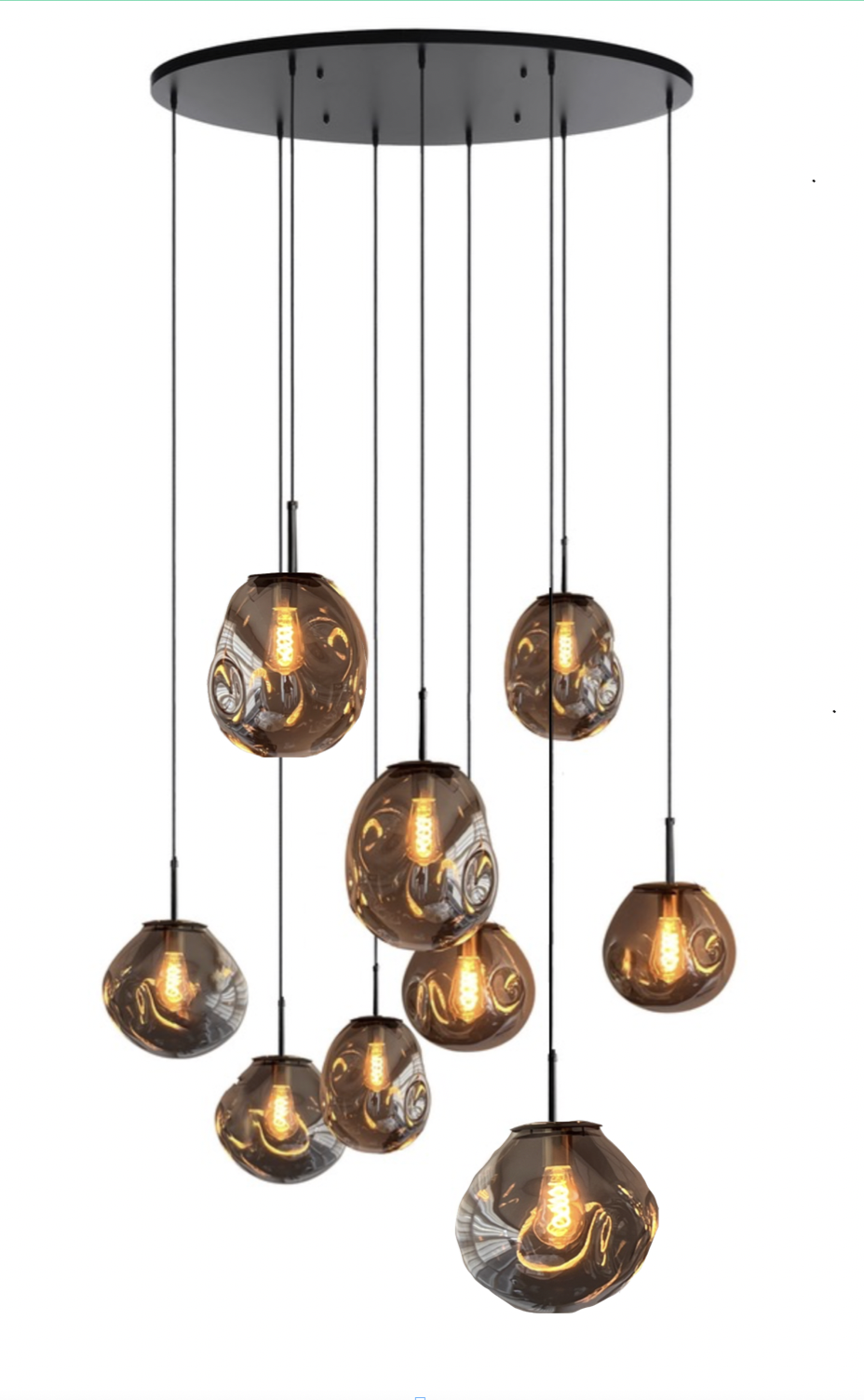 Deze glazen hanglamp is uitgevoerd met 9 amberkleurige glaskappen. De glasbollen zijn van zeer hoge kwaliteit en geven in combinatie met dimbare LED filament lampen een sfeervol licht, uitgeschakeld hebben de glasstolpen een licht spiegelend effect. 'DINO EGGS' is leverbaar met een zwarte ronde-, ovale- of rechte plafondplaat. De glaskappen zijn leverbaar in de volgende kleurstellingen: AMBER, SMOKE(black), ROSE of GOUD alsmede in verschillende formaten.